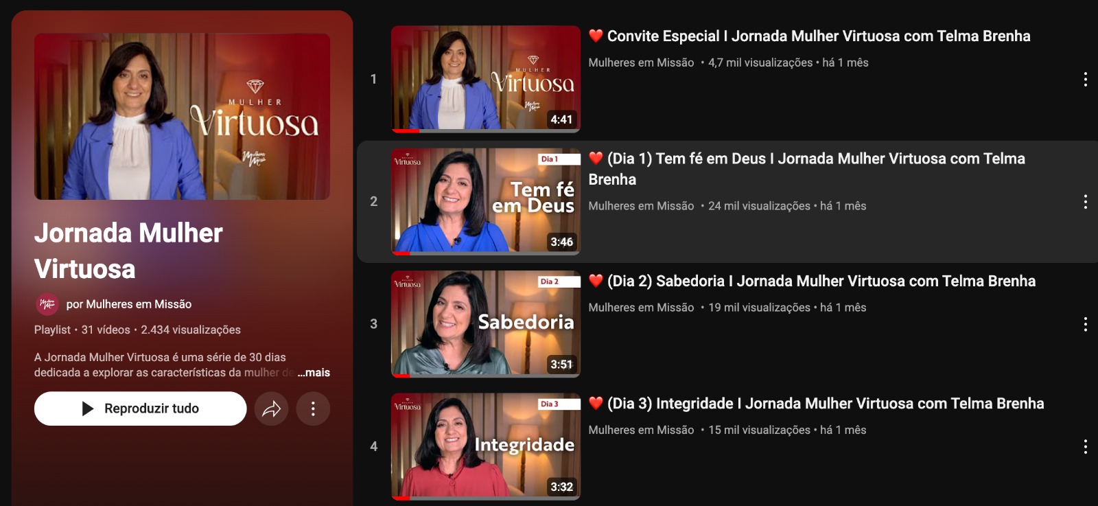 Durante o mês de setembro, mais de 347 mil mulheres ao redor do mundo foram impactadas pela “Jornada Mulher Virtuosa”, conduzida por Telma Brenha. O programa, com 30 episódios, abordou como aplicar na vida prática as virtudes da mulher virtuosa descritas em Provérbios 31. Com participação ativa de mulheres de 22 países, a iniciativa alcançou não apenas números expressivos, mas também profundas transformações pessoais.