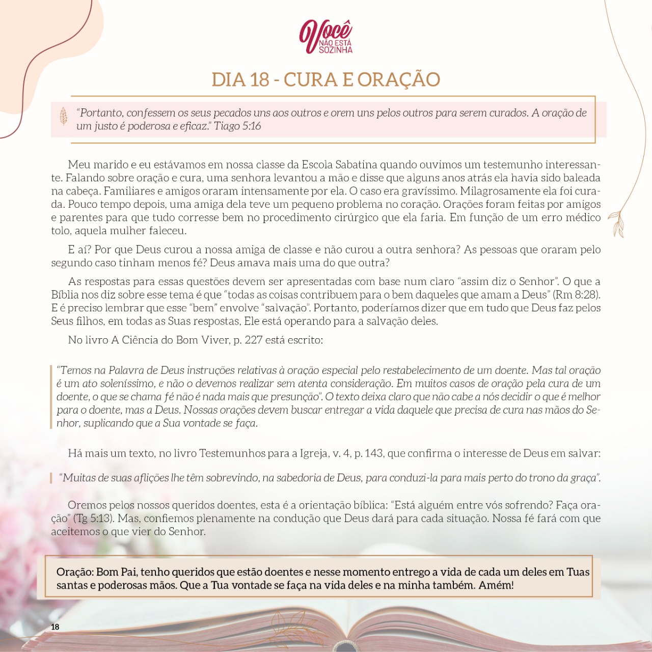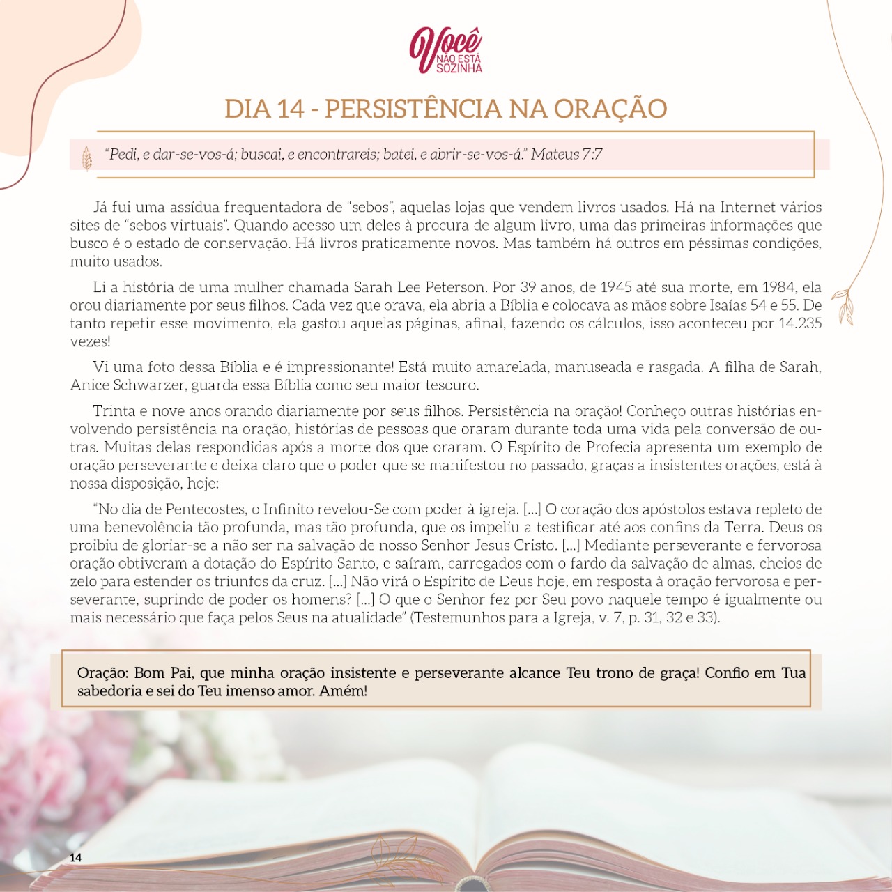 Vamos entender o poder que existe em persistir na oração. O poder de orar por você mesma, orar por seu esposo, por seus filhos, por sua família. Orar em todo o tempo e em todos os momentos. Vamos nos consagrar e buscar as bençãos de Deus para a nossa vida. Se prepare e participe dessa Jornada Espiritual. Tenha certeza,
